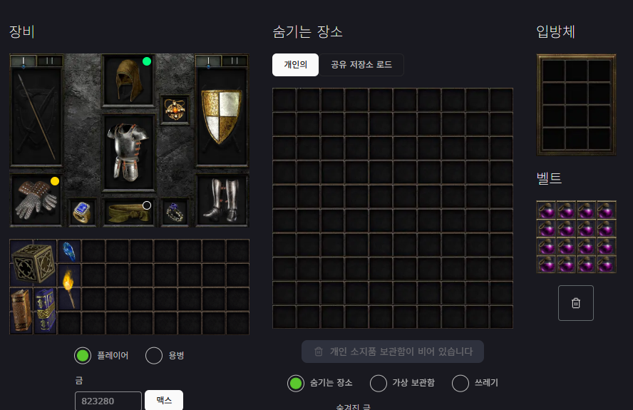 기본 프리셋은 투구는 샤코, 무기는 죽숨, 갑옷은 수수께끼, 방패는 불사조, 신발은 배추, 템창에는 악마술사 횃불, 장갑은 트랑, 벨트는 스파이더웹, 반지는 오팔베인 링, 레이븐 프로스트링 이렇게 두가지가 세팅이 된다.