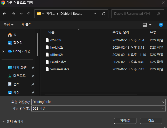 5) 그리고 이후에는 Save to file 을 눌러  C:\사용자\(사용자이름)\저장된게임\Diablo II Resurrected에 저장을 하게 되면 아래의 스크린샷 위치에 저장해두면 된다.